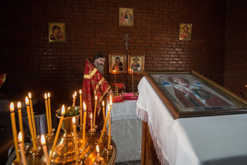 Весть о приезде разлетается быстро и с разных отделений начинают сходится прихожане: кто-то самостоятельно, а другим же нужно помочь добраться до храма. В храме Святителя Николая Чудотворца священники совершали праздничную литургию, на которой прихожане активно подпевали тропарь Воскресения Христова. Все облачения, престол, покровцы — праздничного красного цвета.