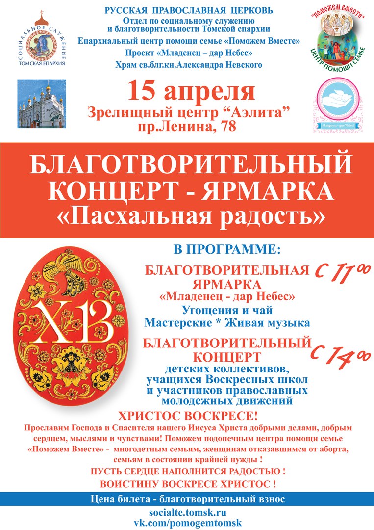 Дорогие томичи! Православный центр помощи семье «Поможем Вместе», приглашает Вас на ярмарку «Пасхальная радость», которая состоится 15 апреля в 11.00 в зрелищном центре Аэлита!